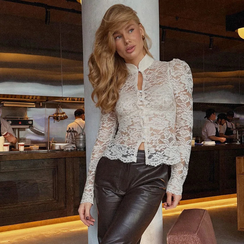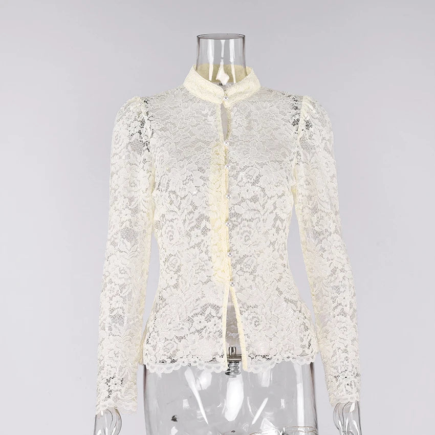 Linad Elegant Sheer White Embroidery Blouses Women Autumn Street Chic Lace Stand Collar Shirt And Blouse 2025 Casual Tops Female
