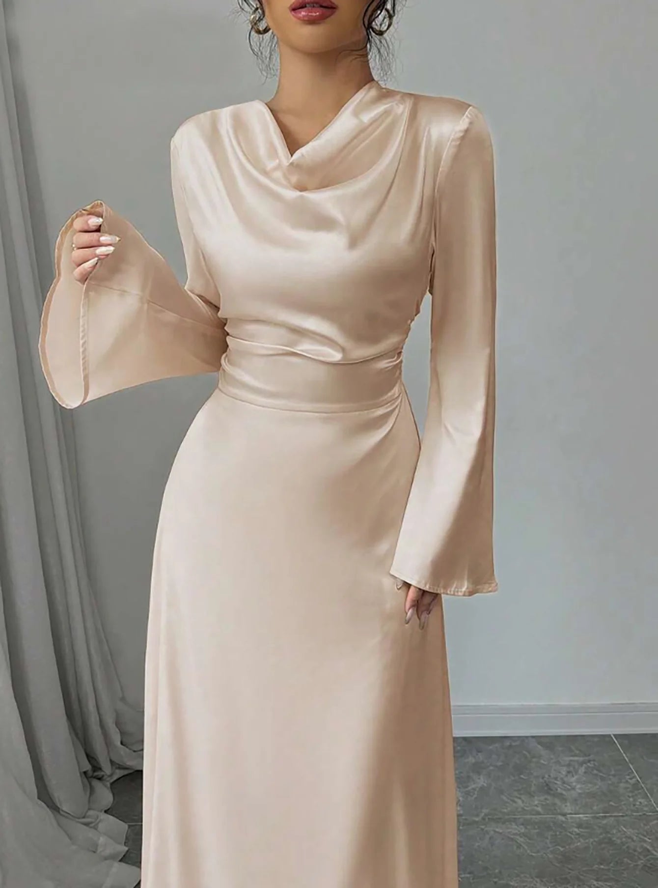 Maxi Dress Spring Summer Women Champagne Satin Cowl Neck Flared Sleeve Belted Elegant Luxurious Party Wedding Evening Dress