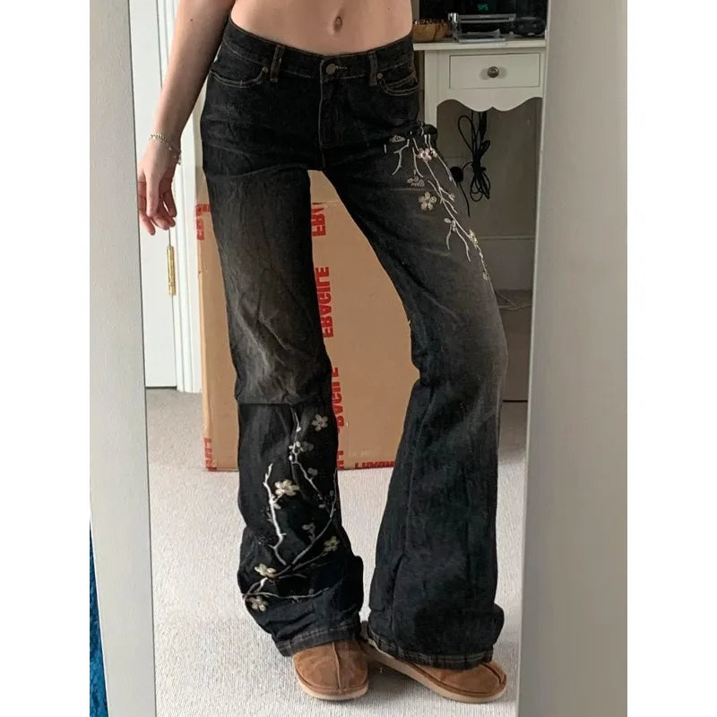 Weekeep Floral Embroidery Jeans Vintage 2000s Low Rise Flared Jeans Women Retro Baggy Denim Pants High Street Basic Trousers